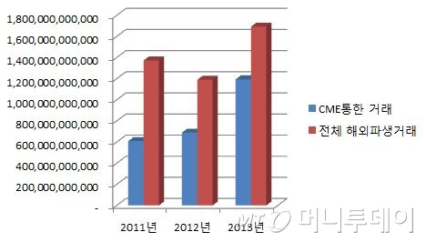 CME는 160년 역사를 가진 세계 최대 파생상품 거래소로 금리와 주가지수, 외환(FX), 에너지, 농산물, 금속, 날씨 및 부동산을 기초자산으로 한 다양한 선물과 옵션상품을 취급한다. 국내 투자자의 해외파생 거래 중 상당 부분이 CME를 통해 이뤄진다. 지난해 기준으로 국내 해외파생 투자액 1조6923억달러(1726조원)중 CME를 통한 거래액은 1조1938억 달러(1218조원)로 70.54%에 달한다.