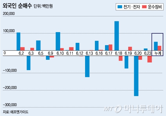 외국인이 대형주 위주로 바구니에 담고 있다는 점도 작년과 비슷하다. 대형주는 이달 들어 조정을 받기도 했지만 아직까지 외국인이 사들이는 규모가 좀 더 많다. 외국인은 이달 들어 전기전자와 운수장비 업종을 각각 502억4000만원, 267억800만원어치 순매수했다.