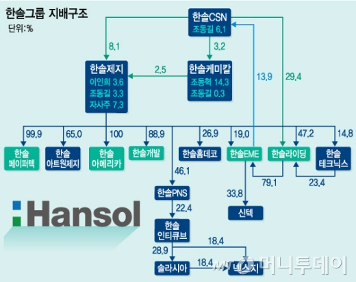 지주사 역할을 하고 있는 한솔제지는 이인희 한솔그룹 고문이 3.51%의 지분을 보유하고 있고 이 고문의 삼남인 조동길 한솔그룹 회장이 3.34%의 지분을 확보하고 있다. 한솔씨엔이스(8.07%), 한솔케미칼(2.47%) 등 특수관계인 지분까지 포함해도 대주주 지분율은 17.79%에 불과하다. 오너 일가는 한솔제지를 통해 한솔아트원제지(64.98%), 한솔PNS(46.07%), 한솔개발(91.01%), 한솔페이퍼텍(99.94%), 한솔라이팅(47.22%) 등 주요 계열회사를 거느리고 있다.