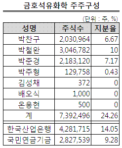 금호석유화학의 경영권 지분은 박찬구 회장(6.67%) 일가가 보유한 24.26% 수준이다. 개인 주주로는 박찬구 회장보다 고(故) 박정구 명예회장의 장자인 박철완 금호석유화학 상무(보)이 더 많은 지분(10%)을 갖고 있다. 하버드 경영학 석사(MBA) 출신의 박철완 상무는 회사 내에서 차기 오너 수업을 받고 있다.