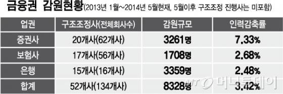 28일 금융권에 따르면 2013년부터 지난 5월까지 증권과 보험, 은행 등 134개 금융회사 가운데 52개사가 인력 구조조정을 실시해 총 8328명이 짐을 싼 것으로 나타났다. 이는 증권과 보험, 은행권 종사자 23만8000여명 중 3.42%에 해당하는 수치다. 최근 진행됐거나 진행중인 대형 증권사, 보험사의 희망퇴직을 감안하면 연내 1만여명을 육박할 것이라는 관측도 나온다.