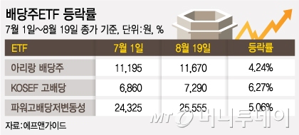 거래소가 새 배당지수를 발표하면 이를 추종하는 ETF는 이르면 연말께 나올 것으로 보인다. 현재 거래소에는 배당주ETF로 '아리랑배당주' '파워고배당저변동성' '코세프(KOSEF)고배당' 등 3종이 상장돼 있다.