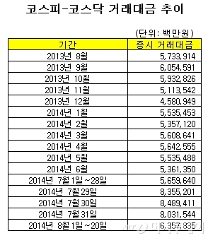 증시 거래대금은 이달 들어 한단계 '레벨업'된 모습이다. 8월(1일~20일) 일평균 거래대금은 6조3578억원으로 올해 일일 평균치인 5조6530억원를 7000억원 가량 상회하고 있다.