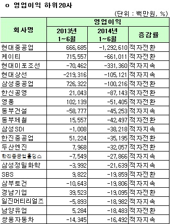 반면 영업이익이 전년 동기 대비 줄어든 곳 대부분이 건설과 조선업체로 나타났다.현대중공업(419,500원 ▲11,500 +2.82%)의 상반기 누적 영업손실액이 1조2900억원으로 분석 대상 기업 중 영업손실 규모가 가장 컸다.
