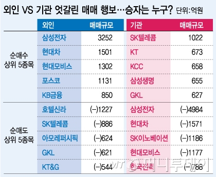 지수는 박스권에 있지만 외인과 기관은 상이한 매매행보를 보이는 중이다. 이날 한국거래소에 따르면 지난달 18일 이후 약 2주 동안 외인이 코스피 시장에서 가장 많이 사들인 종목은삼성전자(206,000원 ▲2,000 +0.98%)로 매수 규모는 3252억원에 달한다. 이어현대차(489,500원 0%)(1501억원),현대모비스(402,500원 ▲1,000 +0.25%)(1302억원) 순이다.