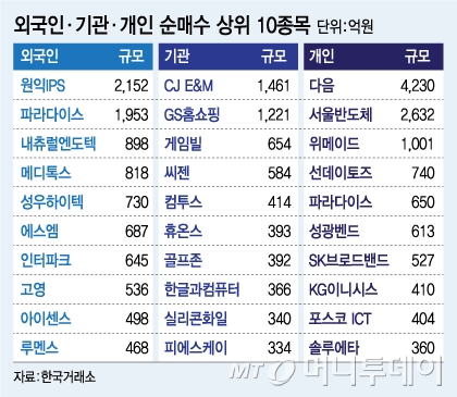 외국인은파라다이스(15,170원 ▲350 +2.36%)(1953억원),내츄럴엔도텍(2,325원 ▼65 -2.72%)(898억원),메디톡스(101,900원 ▼2,600 -2.49%)(818억원) 등을 바구니에 담았고 기관은CJ E&M(1461억원),게임빌(19,640원 ▲940 +5.03%)(654억원),컴투스(34,050원 ▲250 +0.74%)(414억원) 등 을 순매수했다. 개인은위메이드(20,700원 ▲50 +0.24%)(1001억원),선데이토즈(7,100원 ▲260 +3.8%)(740억원) 등에 열광했다. 이밖에원익IPS(28,000원 ▲350 +1.27%),다음(47,700원 ▲400 +0.85%)등도 8월 이후 52주 최고가를 경신하는 등 실적 전망이 견고한 반도체장비와 인터넷 기술주가 오름세를 과시했다.