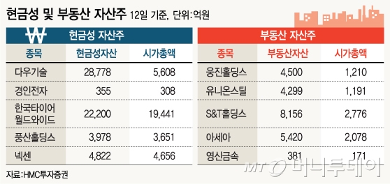 ◇향후 이익보다는 현재의 자산가치에 주목하라=이영원 HMC투자증권 투자전략팀장은 "제한적인 이익 모멘텀 속에서 현금성 자산주나 부동산 자산주는 현재의 자산가치로 투자가치를 보장한다"며 "특히 새 경제팀의 적극적인 내수부양은 향후 자산주에 대한 관심을 더욱 고조시킬 것"이라고 판단했다.
