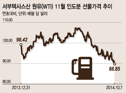 현지시간으로 7일 뉴욕상업거래소(NYMEX)에서 서부텍사스산 원유(WTI) 11월 인도분 선물은 전일대비 1.49달러(1.7%) 하락한 배럴당 88.85달러에 마감했다. 이는 지난해 4월 이후 18개월래 최저치다. 런던 ICE선물시장에서 북해산 브렌트유 11월 인도분도 이날 배럴당 92.11달러에 거래되며 2012년 6월 이래 최저치를 기록했다.