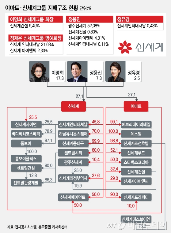 ◇낮은 2세 지분…승계는 언제쯤=신세계그룹은 지배구조가 안정적이지만 향후 경영권을 물려받을 정 부회장과 정유경 부사장 남매의 지분이 너무 낮다는 평가가 나온다. 이 회장은 이마트와 신세계 지분을 각각 17.3%씩 보유하고 있고 정 부회장과 정 부사장이 신세계와 이마트 주식을 각각 9.84%(정용진 7.32%, 정유경 2.52%)씩 들고있다.