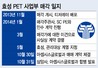 효성은 PET 사업부를 지난해 말 매물로 내놨다. 삼양사를 포함해 코오롱인더스트리, 롯데알미늄,LG생활건강(251,500원 ▼3,000 -1.18%)등이 관심을 보였지만 가격차이로 매각 일정이 지연됐다. 당시 시장가치는 3000억원 수준으로 평가됐지만 효성에서는 4000억원대를 원한 것으로 알려졌다.