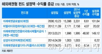 펀드평가사 제로인에 따르면 해외 채권형펀드에서는 올들어 지난 23일까지 1168억원의 자금이 빠져나갔다. 올들어 6월까지만 해도 7776억원의 자금이 유입됐지만 7월부터는 하이일드채권 펀드를 중심으로 8994억원이 환매됐다. 반면 미래에셋의 해외 채권형펀드는 올들어 5375억원의 자금을 흡수하면서 총 설정액이 2조3904억원으로 늘었다.