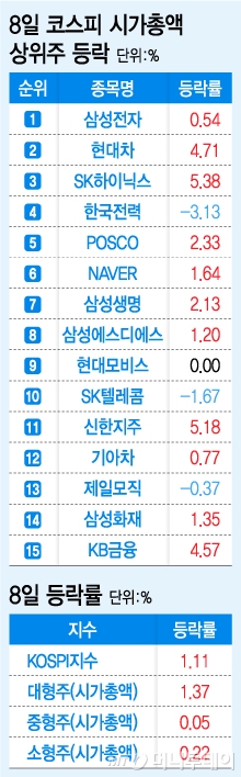 8일 코스피지수는 전일대비 20.82p(1.11%) 오른 1904.65로 마감했다. 특히 시가총액 상위종목들의 상승세가 두드러졌다. 현대차가 4.7% 올랐고 SK하이닉스도 5.4% 상승 마감했다. 포스코가 2.3%, 신한지주가 5%, KB금융이 4.5% 오르는 등 전반적으로 대형주에 대한 투자심리가 회복되는 모습이다. 삼성전자는 0.54% 오르며 131만4000원에 거래를 마쳤다.