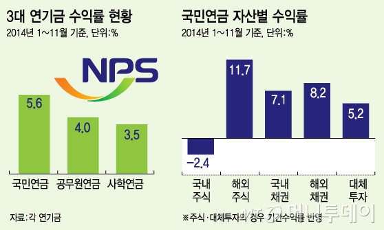 공무원·사학연금 등 3대 연기금과 주요 공제회의 같은 기간 수익률이 3~4%에 그친다는 점을 고려하면 국민연금의 '선전'이 두드러진다. 국민연금의 운용자산 규모는 지난해 11월 말 기준 469억원으로 공무원연금(4조원)이나 사학연금(11조원)을 크게 웃돈다.