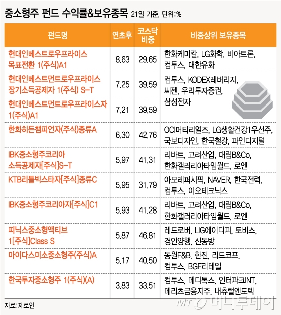 ◇코스닥 비중 높은 중소형주 펀드 '선전'=펀드평가사 제로인에 따르면 21일 기준으로 중소형주식 펀드는 연초이후 평균 3.20%의 수익률을 기록했다. 같은기간 주식형 펀드의 평균 수익률 1.14%를 상회하는 수치다.