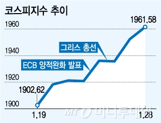 국제유가 급락 등 대외 불확실성이 지속되며 연초 1900선을 하회한 코스피지수는 유로존 양적완화를 전후로 본격적인 반등에 나섰다. 지난주 2.5% 상승한데 이어 이번주 들어서도 1% 넘게 올랐다. 유동성 확대에 대한 기대감으로 위험자산 회피 현상이 진정되면서 투자심리가 회복되고 있다는 분석이다. 배성영 현대증권 연구원은 "유로존 양적완화로 시장 리스크가 완화되면서 국내 주식시장으로 자금이 편입될 환경이 조성됐다"고 설명했다.
