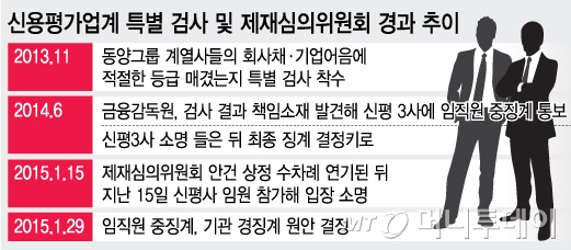 통상 기관대상 경징계는 기관경고와 기관주의가 해당하는데 이번 신평사대상 제재는 동양사태 등 사회적 파장이 큰 사건과 연관이 있었던 만큼 기관경고가 내려진 것으로 알려졌다. 기관경고 처분을 받으면 1년간 신규사업 진출이 제한된다. 임직원의 경우 중징계 대상인데 해임권고(직원은 면직), 직무정지(정직), 문책경고(감봉)이 포함된다. 사실상 신평사 임직원들에 더 무거운 책임을 물은 것이다.