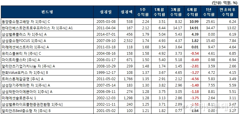 동양중소형고배당 자 1[주식] C가 한 주 동안 2.24%로 수익률이 가장 좋았고 현대인베스트먼트로우프라이스 자 1[주식] A1(2.12%), 삼성중소형FOCUS 1[주식] A(1.74%), 유리스몰뷰티 자 [주식] C(1.58%) 등의 수익률도 양호했다.