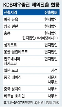 대우증권은 지난해 말 기준 미국·영국·중국·일본·인도네시아·베트남·싱가포르 등에서 현지법인 7개, 지점 1개, 사무소 3개, 투자자문사 1개를 보유하고 있다. 중국에선 투자자문사(베이징)와 사무소(베이징·상하이) 등 3곳의 거점을 운영 중이다. 상하이 사무소의 경우 1995년 개소 이후 2004년 폐소했다가 2011년 재개소했다.