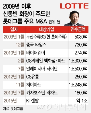 2009년 이후 롯데그룹이 인수한 기업은 국내외 20여개, 투입된 자금만 7조원이 넘는다. 2009년 1월 두산주류BG(5030억원)를 시작으로 GS레테일 백화점·마트 부문(1조3000억원), 하이마트(1조2480억원) 등을 사들였다. 해외 시장에서도 M&A를 감행해 말레이시아 석유화학회사인 타이탄(1조5000억원), 중국 홈쇼핑업체 럭키파이(1500억원) 등을 인수했다.