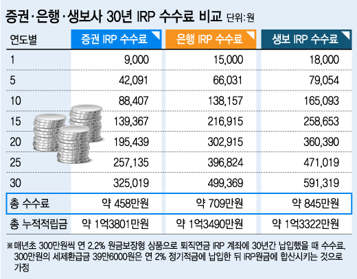 '연말정산 대란' 이후 절세상품으로 떠오른 IRP(개인형 퇴직연금계좌)의 수수료율이 금융회사별로 최대 2배까지 차이나는 것으로 조사됐다. 매년 300만원씩 최저 수수료로 30년간 투자하면 최고치보다 약 500만원을 아낄 수 있는 것으로 나타났다. 300만원은 올해부터 퇴직연금에 추가로 부여되는 세액공제 한도다.