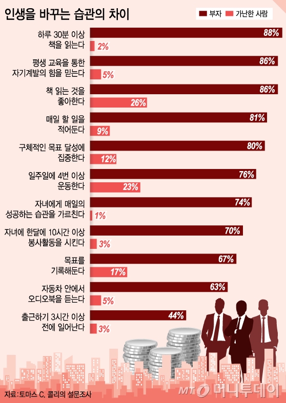 성공한 사람들을 무엇이든 공통점으로 묶을 수 있다면 그건 환경이 아니라 습관이다. '부자 되는 습관'(Rich Habits)의 저자 토마스 C. 콜리는 223명의 부자들과 128명의 가난한 사람들을 대상으로 습관을 조사했다. 부자들은 연간 16만달러 이상을 벌고 순자산이 320만달러가 넘는 사람들이다. 가난한 사람들은 연간 소득이 3만달러 이하이고 순자산이 5000달러 미만이다. 이 결과 부자들과 가난한 사람들의 일상 습관은 천양지차였다.