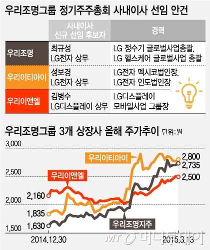 16일 관련업계에 따르면우리조명(1,060원 ▼9 -0.84%),우리이티아이(2,240원 ▲20 +0.9%),우리이앤엘(915원 ▲1 +0.11%)은 이달 27일 예정된 정기 주주총회 후 이사회를 열어 LG전자 등에서 영입한 임원들을 대표이사에 선임할 예정이다.