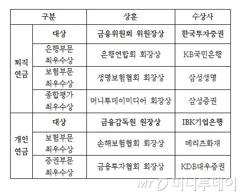 국민은행·삼성생명·삼성증권 퇴직연금 최우수상, 메리츠화재·대우증권 개인연금 최우수상 선정
