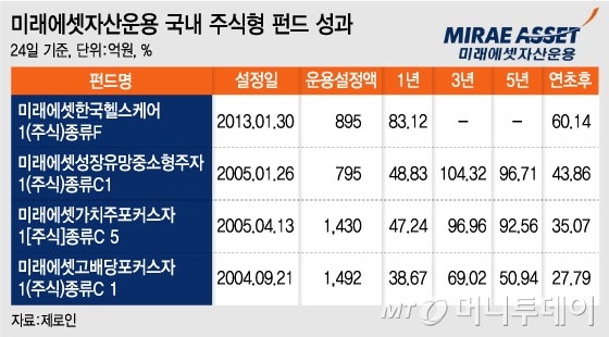 높은 수익률에 힘입어 올들어 국내 주식형펀드의 환매 행진 속에서도 미래에셋운용으로는 자금이 유입됐다. 가치주포커스 펀드와 고배당포커스 펀드로는 올들어 각각 1330억원과 1144억원이 들어왔다. 헬스케어 펀드와 성장유망중소형주 펀드로는 각각 169억원과 467억원이 유입됐다. 같은 기간 국내 주식형펀드에서는 6조8014억원이 빠져나갔다.