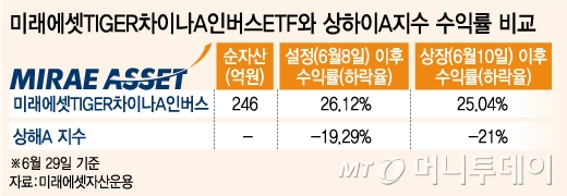 30일 금융투자업계 등에 따르면 실제로 미래에셋 인버스ETF를 상장한 이후 전날(29일) 보유한 투자자가 거둔 수익률은 25%에 달했다. 반면 같은 기간 중국본토 증시인 상하이A 지수는 20% 넘게 하락했다. 중국본토 증시에 상장된 주식을 담은 펀드들의 경우도 동일 기간 평균 수익률이 마이너스(-) 16%(펀드평가사 제로인 기준)에 육박했다.
