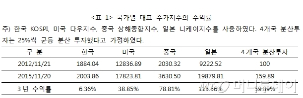 <표 1>에서 보는 바와 같이 한 국가에만 투자하는 것이 아니라 4개 국가에 25%씩 나누어 투자한 투자자의 손익은 위험 대비 만족스러울 수 있다. 이처럼 위험 대비 기대수익률의 안정성이 높다는 것이 분산투자의 장점이다.