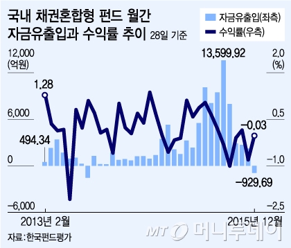 하지만 이달들어 채권혼합형 펀드는 미국의 금리인상으로 채권 수익률이 악화될 것이라는 우려가 커지며 월간으로 자금흐름이 순유출로 전환, 929억원이 빠져나갔다. 지난 2013년 9월 이후 2년3개월만이다. 실제로 채권혼합형 펀드의 수익률은 지난달 -0.81%, 이달들어서는 -0.03%로 마이너스 수익률을 이어가고 있다.