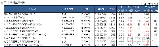 국내 액티브 주식형 펀드(설정액 100억원 이상) 가운데서는 현대모비스, 기아차 등을 편입한 현대현대그룹플러스1(주식)C-A가 한 주 동안 6.81% 오르며 수익률이 가장 좋았다. 성장주에 장기투자하는 라자드코리아(주식)A는 5.93% 수익률이 뛰며 그 뒤를 이었다. 이밖에 이스트스프링코리아리더스[자](주식)A(5.64%), 칸서스하베스트적립식1(주식)K5(4.51%), 신영마라톤통일코리아[자](주식)A형(4.48%) 등이 4~5%대 수익률로 선전했다.