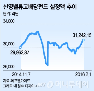 이 가운데 국내 최대규모의 공룡펀드인 신영밸류고배당 펀드의 자금 유입 흐름은 고무적이다. 이 펀드는 2014년 11월초 국내 주식형펀드로는 처음으로 설정액 3조원 시대를 연 뒤 지난해 1분기에 3조3000억원에 육박하는 자금이 몰렸지만 차익실현 환매 등으로 5월말경 2조6000억원대까지 자금이 빠지기도 했다. 이후 3조원 안팎으로 자금유출입이 이뤄지다 10월 중순부터 설정액 3조원을 좀처럼 회복하지 못하고 한해를 마감했다.