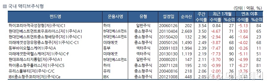 코스닥시장 중심으로 상승하면서 운용펀드 기준으로 순자산 100억원 이상인 펀드 가운데 중소형주 펀드가 강세를 보였다. 하이코리아적극성장형[자](주식)C1는 3.54%, 현대인베스트먼트로우프라이스[자]1(주식)A1는 3.5%, 현대인베스트먼트중소형배당주[자]1(주식)C1는 2.96% 올랐다. 헬스케어 펀드인 동부바이오헬스케어1(주식)A, 미래에셋한국헬스케어[자]1(주식)C-F도 각각 2%대 상승세를 보였다.