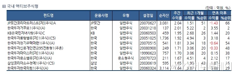 운용펀드 기준으로 순자산 100억원 이상인 펀드 가운데 JP모간코리아트러스트[자](주식)A이 2.04%로 주간수익률이 가장 좋았다. 수익률 상위 10개 중에서 한국투자신탁운용의 펀드가 7개나 진입했다. 한국투자거꾸로1(주식)(A)가 2.01% 올랐고, 한국투자롱텀밸류[자]1(주식)(C5), 한국투자장기주택마련1(주식)(A), 한국투자마이스터[자]1(주식)(A) 등이 1% 이상 올랐다.