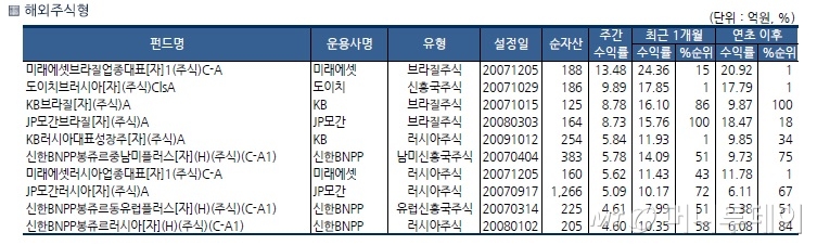 펀드별로는 미래에셋브라질업종대표[자]1(주식)C-A가 13.48%, 도이치브러시아[자](주식)ClsA가 9.89%, KB브라질[자](주식)A가 8.78%, JP모간브라질[자](주식)A가 8.73% 뛰었다.