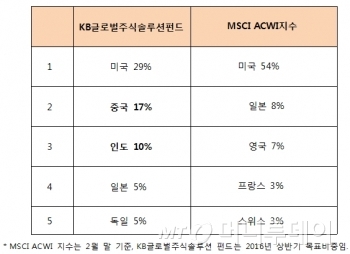 유성천 KB자산운용 리테일본부 상무는 "MSCI ACWI(All Country World Index) 내 미국 비중이 54%로 편중도가 높은 것에 비해 KB글로벌주식솔루션 펀드는 미국 비중을 20%대로 낮추고 성장성이 큰 신흥국 비중을 높여 기대수익을 높였다"며 "개인종합자산관리계좌(ISA)를 통해 가입시 비과세 혜택도 누릴 수 있다"고 설명했다.