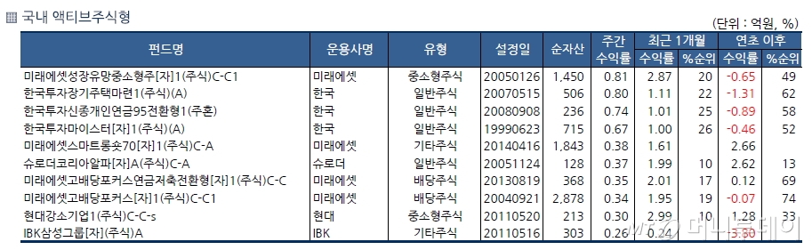 운용펀드 기준으로 순자산 100억원 이상인 펀드 가운데 한국투자배당리더[자]1(주식)(A)(-3.18%), 한국투자골드플랜네비게이터연금전환형1(주식)(C)(-2.89%), 한국투자네비게이터1(주식)(A)(-2.85%) 등 한국투자네비게이터 펀드 시리즈들이 수익률 하위에 이름을 올렸다. 이밖에 동부바이오헬스케어1(주식)A(-2.48%), 한화코리아레전드[자](주식)C-C(-2.36%), 미래에셋한국헬스케어[자]1(주식)C-F(-2.32%) 등도 수익률이 떨어졌다.