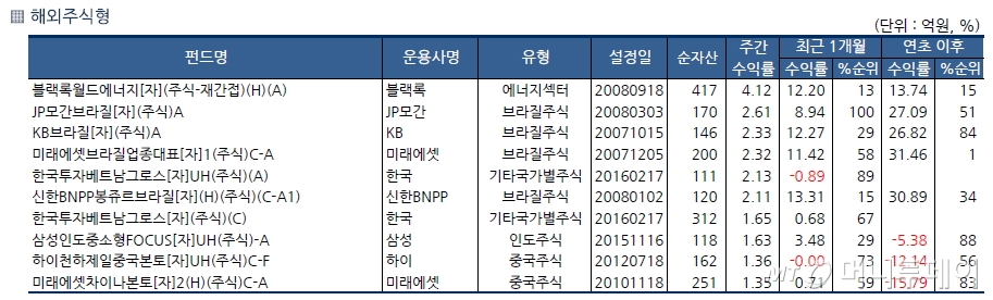 유가 상승으로 에너지 펀드와 브라질 펀드가 선전하며 블랙록월드에너지[자](주식-재간접)(H)(A)의 수익률이 한 주간 4.12% 뛰었고 그 뒤를 JP모간브라질[자](주식)A(2.61%), KB브라질[자](주식)A(2.33%), 미래에셋브라질업종대표[자]1(주식)C-A(2.32%)가 뒤를 이었다.