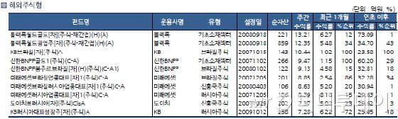 해외 주식형 펀드는 한 주 동안 평균 0.76% 올랐다. 국제 유가 상승의 영향으로 브라질(8.52%), 러시아(6.29%) 주식형 펀드의 성과가 뛰어올랐고 금값 상승으로 금 펀드의 수익률도 좋았다.