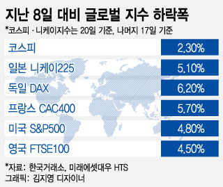 하지만 국내 증시도 삼성전자를 제외하면 이야기는 달라진다. 삼성전자를 제외한 시총은 월고점 대비 지난 17일 4.5% 줄었다. 이는 같은 기간 지수하락률을 0.9%포인트 웃도는 수준으로 미국과 영국의 지수 하락폭과 비슷하다.