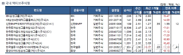 운용펀드 기준으로 순자산 100억원 이상인 펀드 가운데 삼성전자의 신고가 영향으로 삼성그룹주 펀드들이 선전했다. IBK삼성그룹[자](주식)A(2.79%), KB삼성&현대차그룹플러스[자](주식)A(2.90%), 신한BNPP코리아가치성장[자](주식)(C-A1)(2.51%), 한국투자삼성그룹적립식2(주식)(A)(2.41%)은 수익률 상위에 이름을 올렸다.