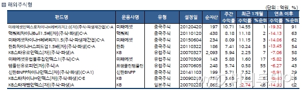 수익률 상위에는 중국 증시의 수익률의 1.5~2배를 추종하는 레버리지 펀드들이 자리했다. 미래에셋인덱스로차이나H레버리지2.0[자](주식-파생재간접)C-A(10.71%), 맥쿼리차이나Bull1.5배[자](주식-파생)C-A(8.18%), 미래에셋차이나H레버리지1.5(주식-파생재간접)C-A(8.09%), 한화차이나H스피드업1.5배[자](주식-파생)C-A(7.41%) 등의 수익률이 급등했다.