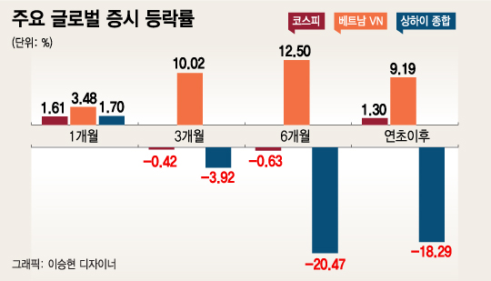 글로벌 증시와 관계없이 상승세를 보이고 있는 베트남 증시를 감안하면 베트남 펀드로 쏠리는 자금유입세도 당분간 지속될 가능성이 높다. 실제로 베트남 VN지수는 연초이후 9% 넘게 상승했으며 최근 6개월 동안 12.50% 올랐다. 연초이후 1.30% 상승하는데 그친 코스피지수나 20% 넘게 하락한 중국 상하이종합지수와 비교하면 베트남 증시의 상승세는 더 두드러진다.