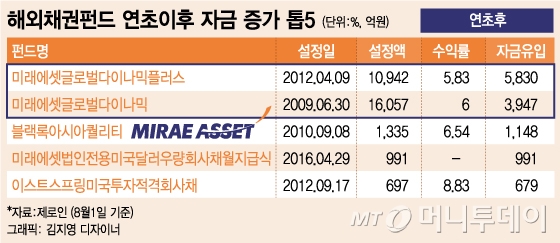 올 들어 부진한 성과 탓에 자금이 빠져나가고 있는 국내 주식형 펀드와 달리 연평균 10%에 육박하는 수익률에 올해만 4000억원 가까운 뭉칫돈이 들어온 해외채권형 펀드가 있다.