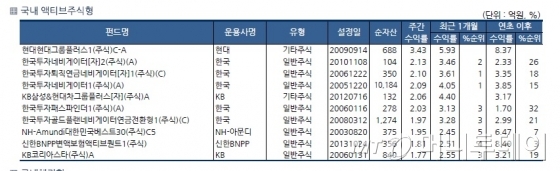 운용펀드 기준으로 순자산 100억원 이상인 펀드 가운데 범현대그룹주에 투자하는 현대현대그룹플러스1(주식)C-A가 3.43% 뛰었다. 현대중공업 등에 대한 투자 심리가 개선된 덕분으로 풀이된다. 한국투자네비게이터[자]2(주식)(A), 한국투자네비게이터1(주식)(A)도 최근 펀드 환매세에도 불구하고 2%가 넘는 양호한 수익률을 기록했다. KB삼성&현대차그룹플러스[자](주식)A도 2.06%, 한국투자패스파인더1(주식)(A)는 2.03% 올랐다.