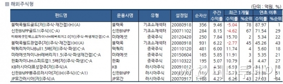 펀드별로는 금펀드가 크게 상승했다. 블랙록월드골드[자](주식-재간접)(H)(A)가 9.46%, 신한BNPP골드1(주식)(C-A)가 8.15%, 블랙록월드광업주[자](주식-재간접)(H)(A)가 6,22% 올랐다. 맥쿼리차이나Bull1.5배[자](주식-파생)C-A는 6%, KB러시아대표성장주[자](주식)A는 4.58% 상승했다.