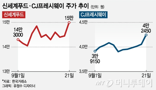 21일 주식시장에서 신세계푸드는 전일대비 3.81% 오른 15만원에 거래를 마쳤다. 급식, 외식, 식자재 유통 등을 맡는 신세계푸드는 이마트 HMR 제품 공급 등을 맡고 있다. CJ그룹 내에서 같은 역할을 담당하는 CJ프레시웨이도 4.69% 오른 4만2450원에 거래를 마쳤다. 6거래일 연속 상승세를 나타내며 한달 새 주가가 17%나 상승했다.
