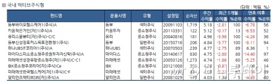 그동안 성과가 부진했던 중소형주 펀드가 크게 반등했다. 운용펀드 기준으로 순자산 100억원 이상인 펀드 가운데 동부바이오헬스케어1(주식)A가 5.18%, 키움작은거인[자]1(주식)A가 5.12%, 유리스몰뷰티[자](주식)-C/C가 4.96% 뛰었다. 동부신성장포커스목표전환형1(주식)은 4.84%, 하나UBSIT코리아1(주식)A는 4.77% 상승했다.