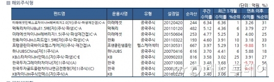 반면 미래에셋글로벌그레이트컨슈머[자]1(주식)C-A에서 62억원, 하나UBS유럽포커스[자](주식-재간접)C1에서 49억원, KB스타재팬인덱스[자](주식-파생)A에서 47억원이 순유출됐다.